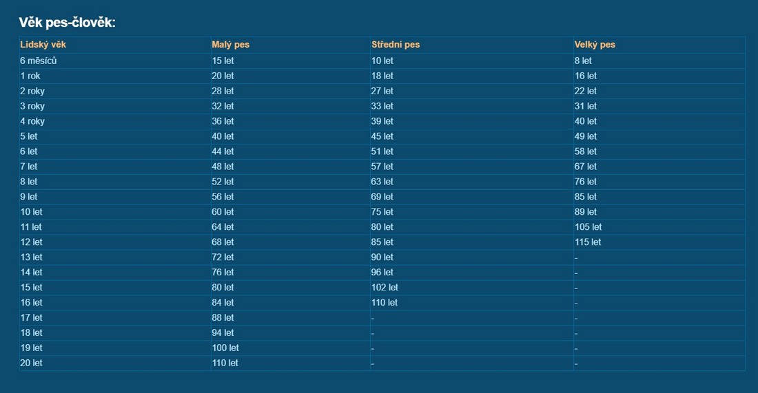 Při čtení tabulky tedy vidíme, že malý pes typu mops ve věku 5 let je v lidském věku 40 let,
